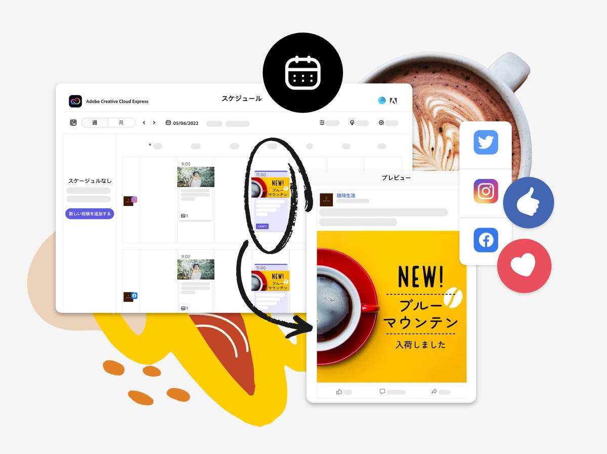 Adobe Expressのコンテンツスケジューラーを使って、ソーシャルメディアの予約投稿を行い、効率的な運用を目指しましょう!